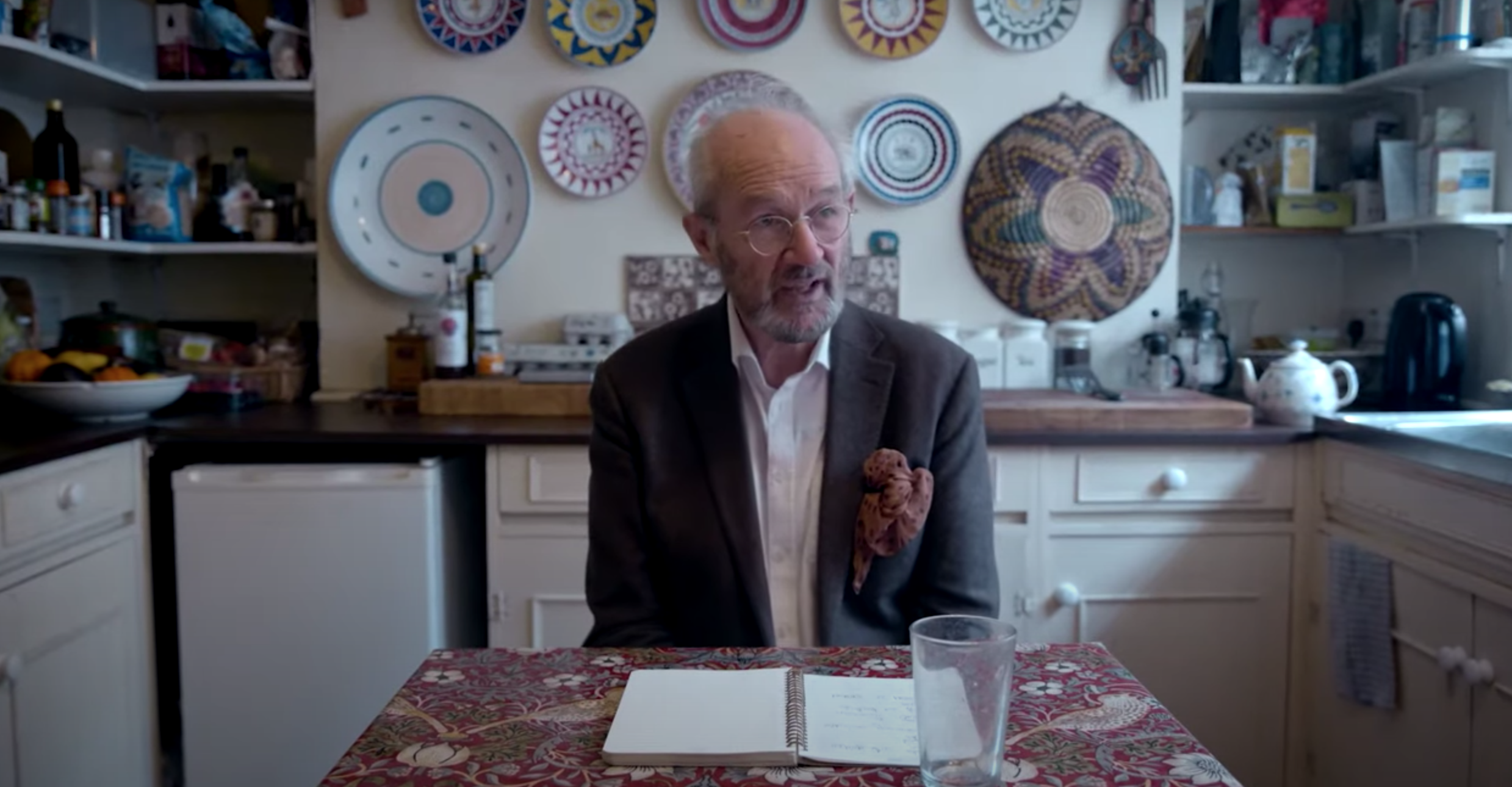 Cinematographer Niels Ladefoged utilizes a shot of John at a kitchen table in his home. Colorful kitchen ware and decor surround him in the background. He is talking to the audience like he might do in the morning while waking up with a cup of coffee and a newspaper.