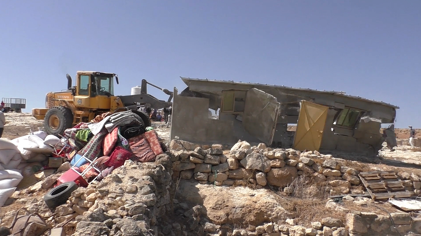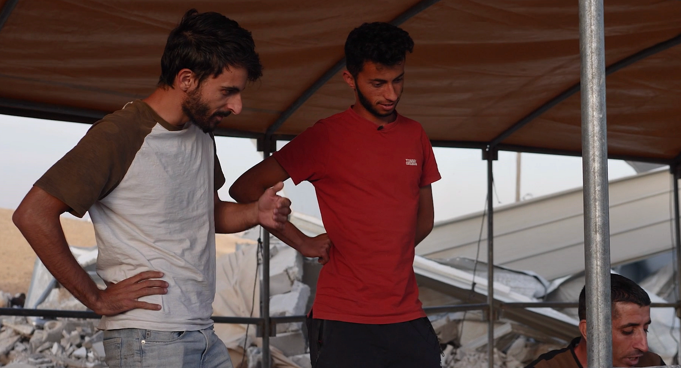 Abraham, a journalist who lives in Jerusalem, drives regularly to Masafer Yatta to cover the home demolitions and spend time with Adra. The camaraderie between Abraham and Adra yields several bittersweet, sincere, and sometimes even amusing exchanges. Both grapple with grief, despair, fatigue, and powerlessness. Israeli policies of apartheid that privilege Abraham and make it harder for Adra to exist only sharpen those feelings.